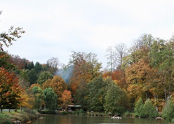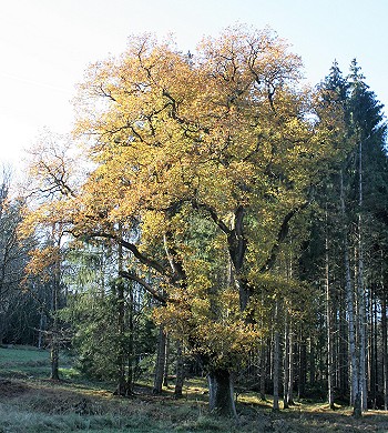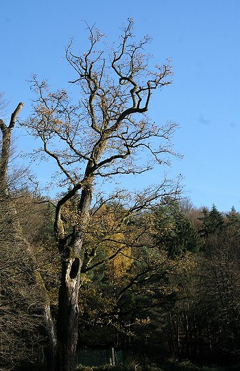 Einige Meter weiter finden sich einige sehr alte imposante Eichen und vor einer, als Naturdenkmal gekennzeichneten, ein Gedenkstein. Er wurde von den Forstbeamten für Graf Karl zu Ysenburg und Büdingen-Meerholz gestellt, der dort am 16.10.1699 seinen letzten Hirsch schoss. Auf der anderen Seite des Weihers geht es zurück zum Parkplatz.