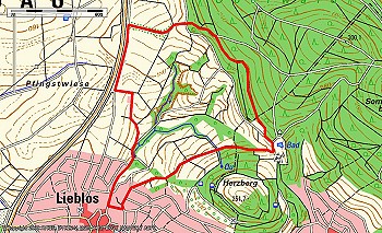 Den kleinsten Gründauer Ortsteil durchquert man komplett von Ost nach West. Weiter geht es am Golfplatz vorbei durch die Felder bis hoch zur Bergkirche in Niedergründau. Weiter geht’s an der Kompostierungsanlage vorbei durch die Felder zurück Richtung Bundesstraße. Man quert diese an einer Unterführung, welche mit Wandmalereien zum 40ten Gemeindegeburtstag Gründaus sowie den Jakobsweg erinnern. Am Waldrand entlang erreicht man dann wieder Lieblos. Am Herzberg und am Sommerberg vorbei geht es dann wieder zurück zum Ausgangspunkt.