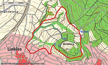 Mit einem Milan ist der kürzeste der Liebloser Wanderwege gekennzeichnet. Die knapp vier Kilometer um den Herzberg sind in etwa einer Stunde zurückzulegen. Vom Startpunkt an der Sommerbergstraße steigt der Weg zusammen mit Fuchs, Specht, Schmetterling und Eule an bis zur „Fahrstraße“ am Waldrand. Dort biegt der Milan als einziger Weg rechts ab und führt am Waldrand entlang zum ehemaligen Waldschwimmbad in Roth. Am unteren Ende des Schwimmbadgeländes geht es rechts ab auf die Straße „Auf dem Herzberg“ und zusammen mit dem Schmetterlingsweg unterhalb vom Restaurant „Paradies“ zurück nach Lieblos. Hier sieht man oberhalb im Wald noch die Reste einiger Mauern, die den dortigen Weinberg terrassierten. Bis ins ausgehende 19. Jahrhundert war fast der gesamte Herzberg ein Weinberg. Erst die eingeschleppte Reblaus bereitete dem ein Ende. Auf dem Herzberg befindet sich auch der ehemalige Liebloser Steinbruch. Bis in die 50er Jahre des vergangenen Jahrhunderts wurde er für große Feste genutzt und beherbergte sogar eine Freilichtbühne. Nachdem durch Frostschäden einige Steine abgestürzt waren, die unter anderem die Umkleideräume zerstörten, wurde der Steinbruch für die Öffentlichkeit gesperrt. Noch ein Stück durch den Ort und man hat den Ausgangspunkt wieder erreicht.